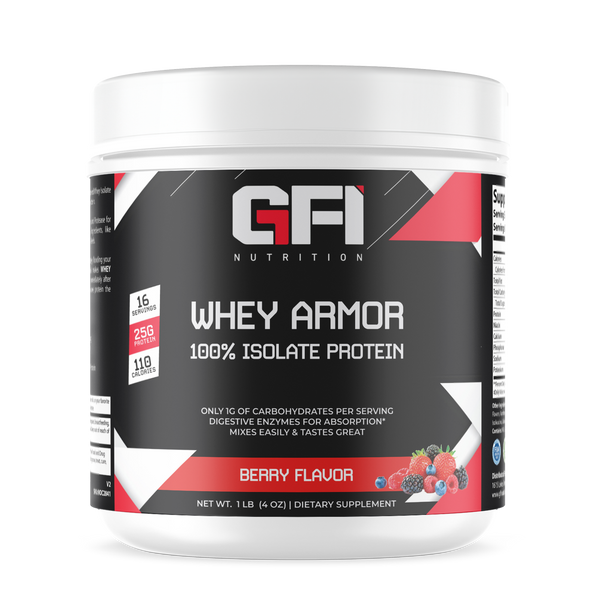 Power your muscles with the cleanest and fastest-digesting protein available. GFI Nutrition’s Whey Armor is made from 100% Ultra-Filtered Whey Isolate, providing 25 g of protein per serving with only 1 g of carbs and less than 1 g of fat. Enhanced with digestive enzymes for maximum absorption, this premium isolate floods your muscles with amino acids, making it the ideal protein to take immediately after training.